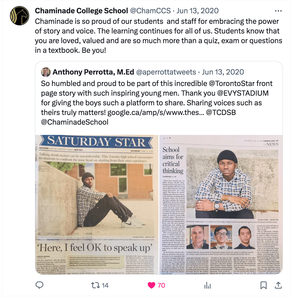 With a cultural responsive approach to storytelling, this video highlights Frame and the students celebrated on the big screen at Yorkdale Silver City. Moderated a staff-focused weekly “connection series,” with the goal to promote staff unity and well-being.Moderated a student-led conversation promoting the power of voice. Co-Moderated a youth connection program with Toronto Police Service.